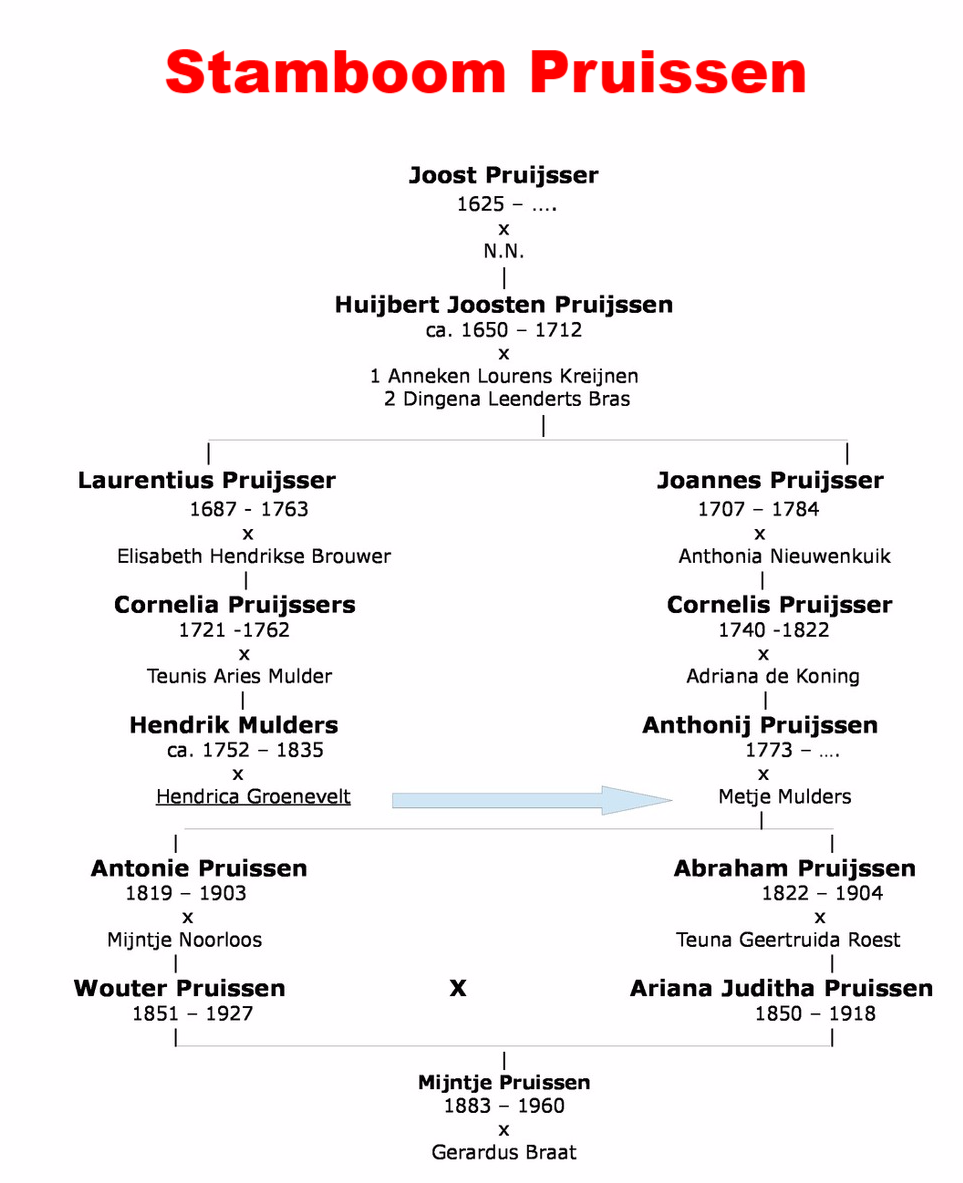- Cornelia Pruijssers (1721 – 1762): getrouwd met Teunis Aries Mulder (Volgt 4a).